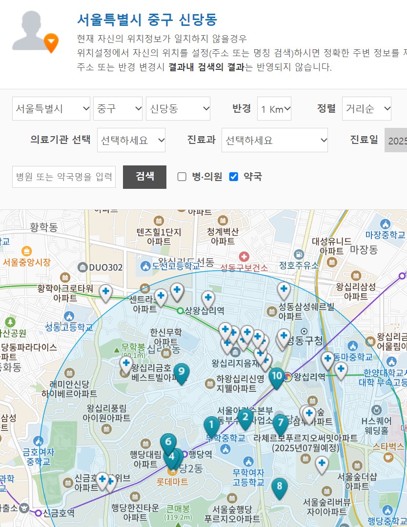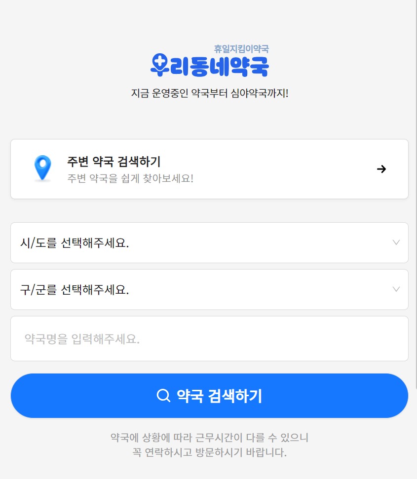 - 지역 검색: 거주지와 가까운 지역을 선택하면 해당 지역의 연휴 기간 운영 병원/약국 정보를 확인할 수 있습니다.